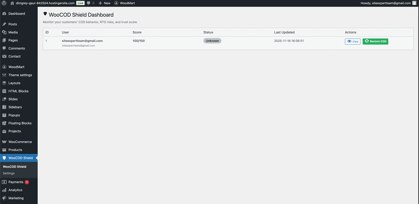 - 🧾 Customer Self View – Customers can check their COD score and activity in My Account.